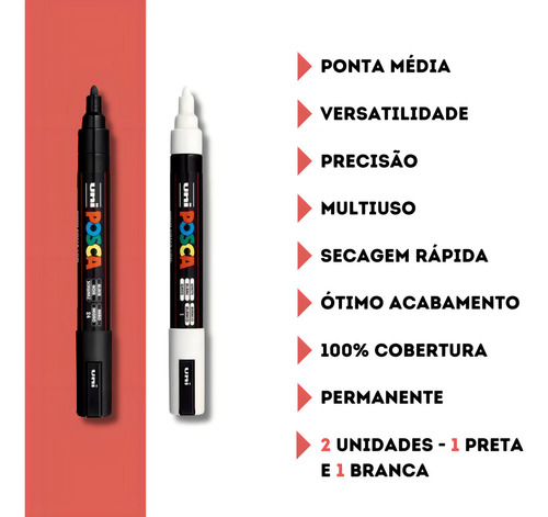 Kit com 2 Canetas Posca PC-5M (Preta e Branca) Marcador multiuso que se destaca por sua versatilidade, permitindo a escrita em diversas superfícies, como cartões, cerâmica, madeira, metais, tecidos, porcelana, plásticos e vidros. Com tinta à base de água, essas canetas oferecem alta tecnologia em pigmentação, resultando em cores intensas e uma cobertura quase 100% opaca. Além disso, são atóxicas e sem cheiro, tornando-as seguras para uso em ambientes variados. A espessura do traço varia de aproximadamente 1.8 a 2.5mm, ideal para detalhes e acabamentos. O corpo em plástico proporciona leveza e conforto durante o uso. As canetas são laváveis e à prova d’água, garantindo durabilidade e resistência em suas criações artísticas.