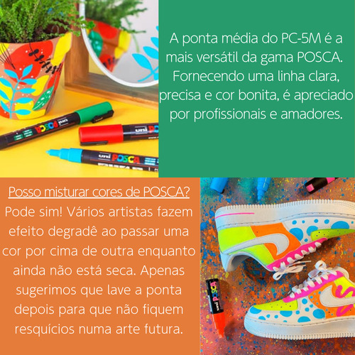 Caneta Posca Pc-5m Unitária Cor Branca – Uni Ball CANETA POSCA PC-5M UNITÁRIO Cor : Branca * CARACTERISTICAS DO PRODUTO * Posca é um marcador à base de água, atóxico e sem solventes. Posca facilita seu trabalho, pois é multiuso e serve para todo tipo de superfície tais como: tecido, madeira, vidro, plástico, papel, cerâmica, porcelana, metais, etc. Detalhes Técnicos: Modelo PC-5M: Espessura do traço 1,8mm a 2,5mm, rendimento aproximado 230 metros lineares. Secagem rápida: Após a aplicação, a secagem é ultra-rápida. Você só precisa de 1 a 2 minutos para ter a peça trabalhada com um acabamento perfeito sem falhas. Tecnologia esfera: Os componentes das tintas dos marcadores Posca são misturados através de uma esfera interna, que proporciona à tinta uma textura homogênea e garante um acabamento de qualidade para sua atividade. 100% Cobertura: Mais uma vantagem para você! Após aplicar a primeira cor, espere secar durante 1 minuto, e já pode passar a segunda por cima, sem manchar a que está embaixo, e com uma excelente cobertura sem falhas. Faça quantas camadas quiser. Fabricado pela Mitsubishi no Japão